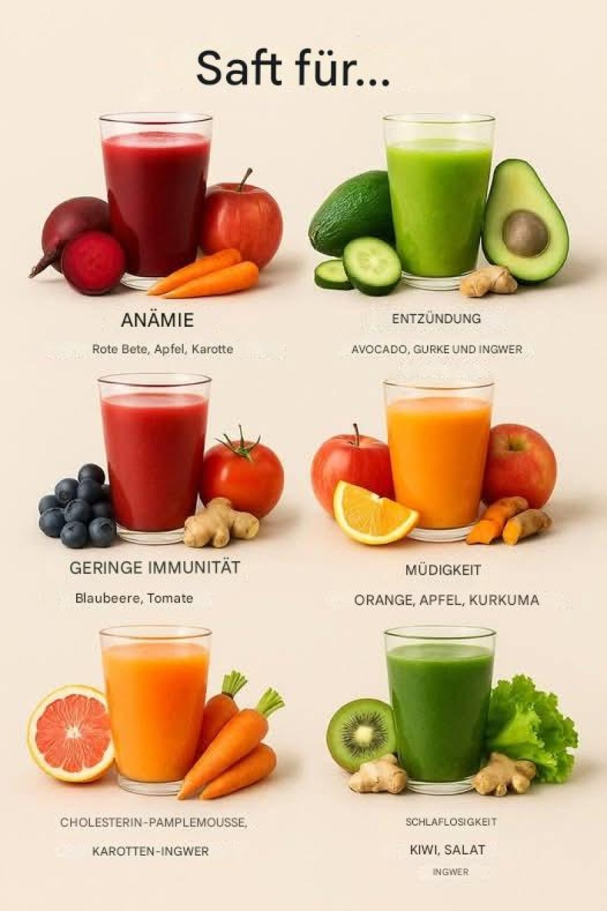 6 wirksame Saftrezepte zur natürlichen Linderung von Anämie, Entzündungen, Müdigkeit, schwacher Immunität, hohem Cholesterinspiegel und Schlaflosigkeit Suchen Sie nach einer natürlichen Möglichkeit, Ihre Energie zu steigern, Ihren Schlaf zu verbessern, Entzündungen zu reduzieren oder Ihr Immunsystem zu stärken? Die Lösung könnte in Ihrer Küche liegen. Frische Obst- und Gemüsesäfte sind eine der einfachsten Möglichkeiten, Ihren Körper mit wichtigen Nährstoffen zu versorgen und bestimmte gesundheitliche Probleme zu behandeln, ohne synthetische Nahrungsergänzungsmittel oder aggressive Medikamente. In diesem Leitfaden stellen wir sechs Saftrezepte vor, die speziell zur Linderung häufiger Probleme wie Anämie, Entzündungen, Müdigkeit, schwachem Immunsystem, hohem Cholesterinspiegel und Schlaflosigkeit entwickelt wurden. Egal, ob Sie sich energiegeladener fühlen, besser schlafen oder Ihrem Körper einfach die Nährstoffe geben möchten, die er braucht, diese Säfte sind für Sie.