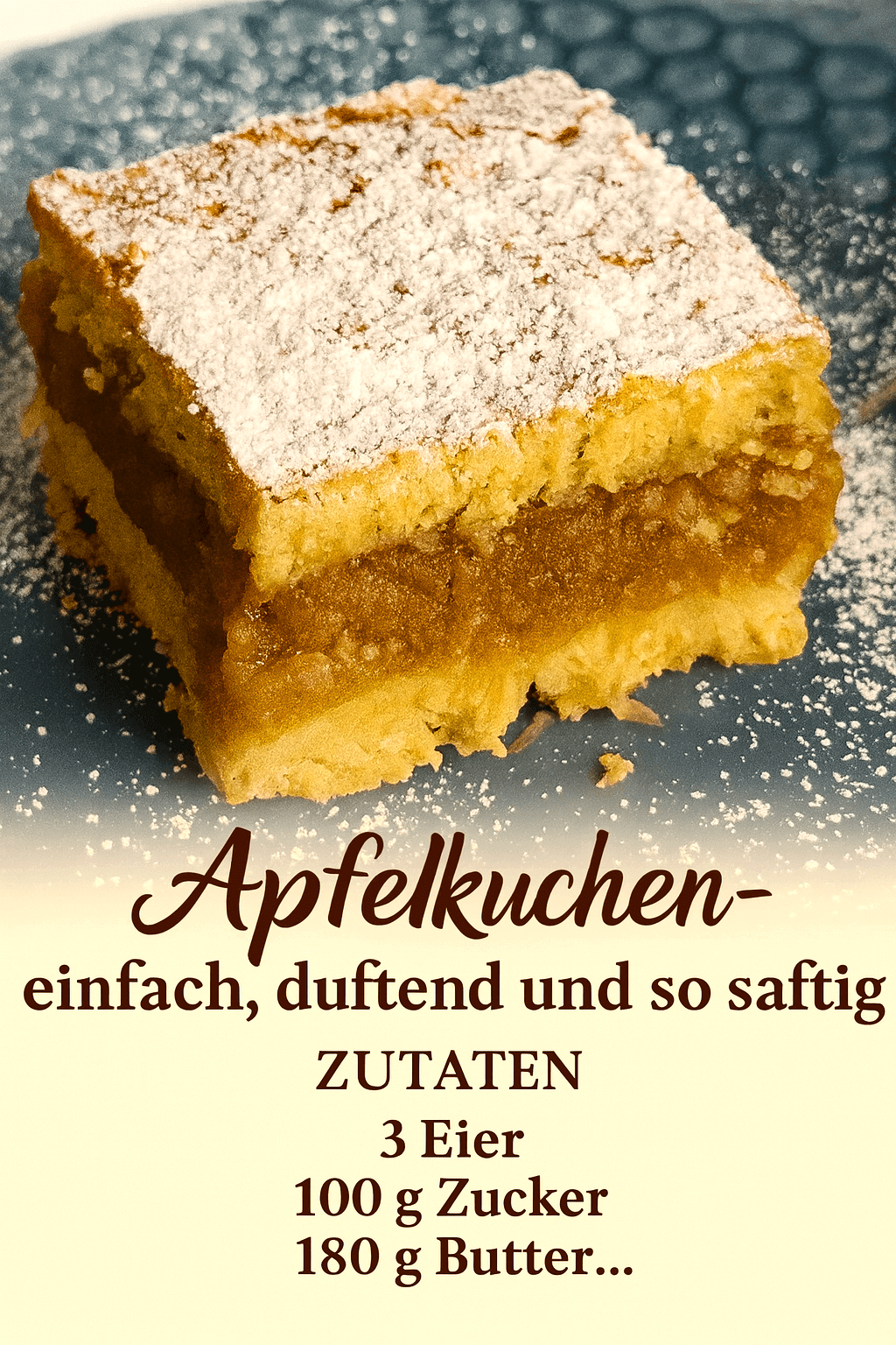 Selbstgemachter Apfelkuchen schmeckt am besten lauwarm oder vollständig abgekühlt und mit Puderzucker bestreut.