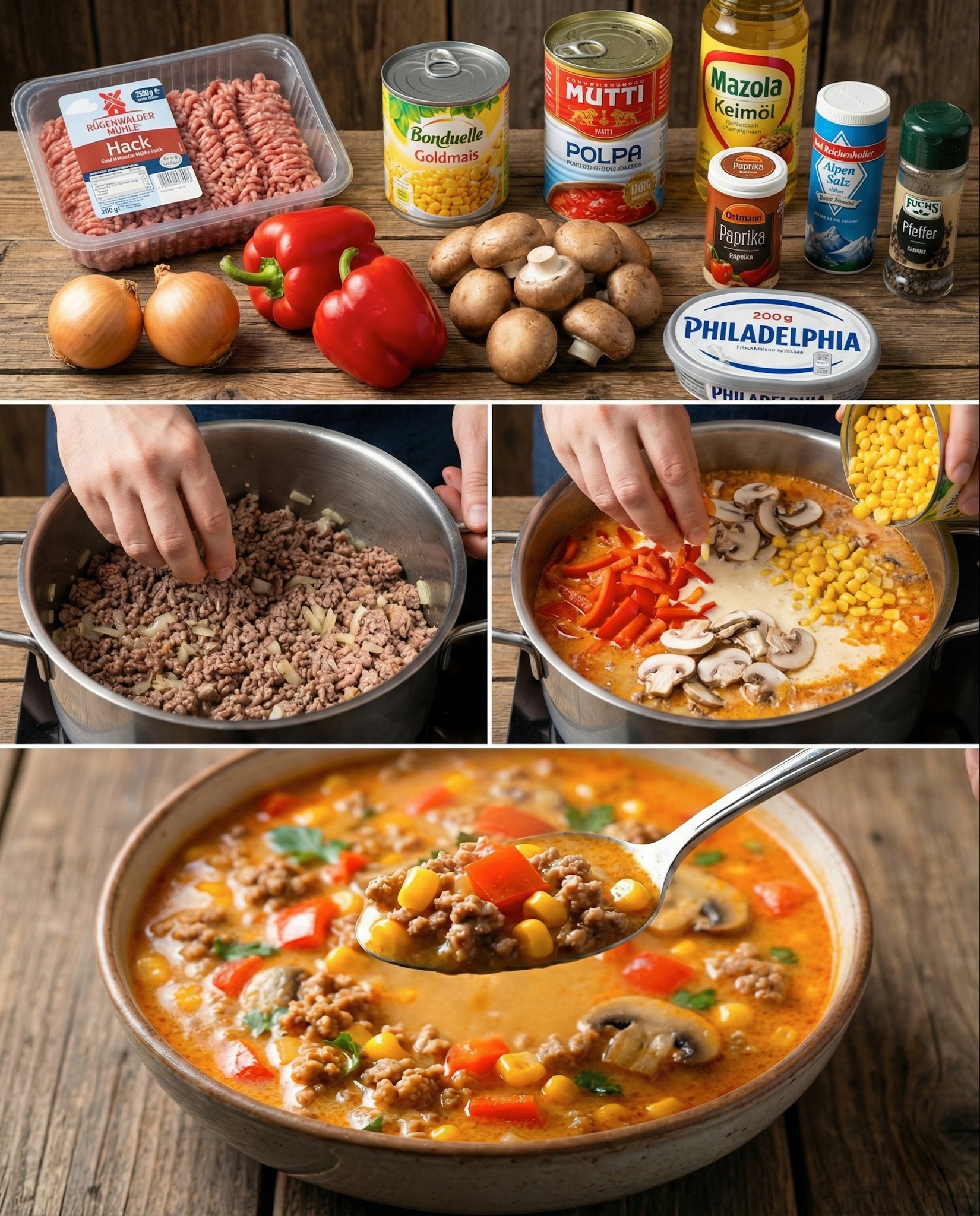 Paprika, Champignons, Mais, gehackte Tomaten und Gemüsebrühe hinzufügen, alles aufkochen und für 15 Minuten leicht köcheln lassen.
