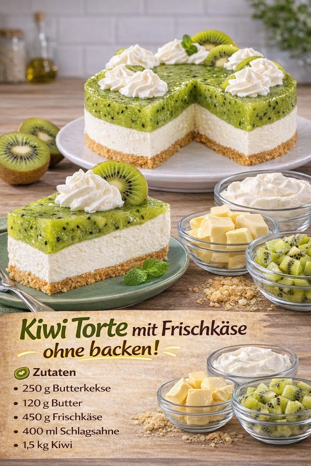 👉 Tipp: Verwende möglichst reife, aber nicht überreife Kiwis – so erhält die Torte die perfekte Balance aus Süße und leichter Säure.