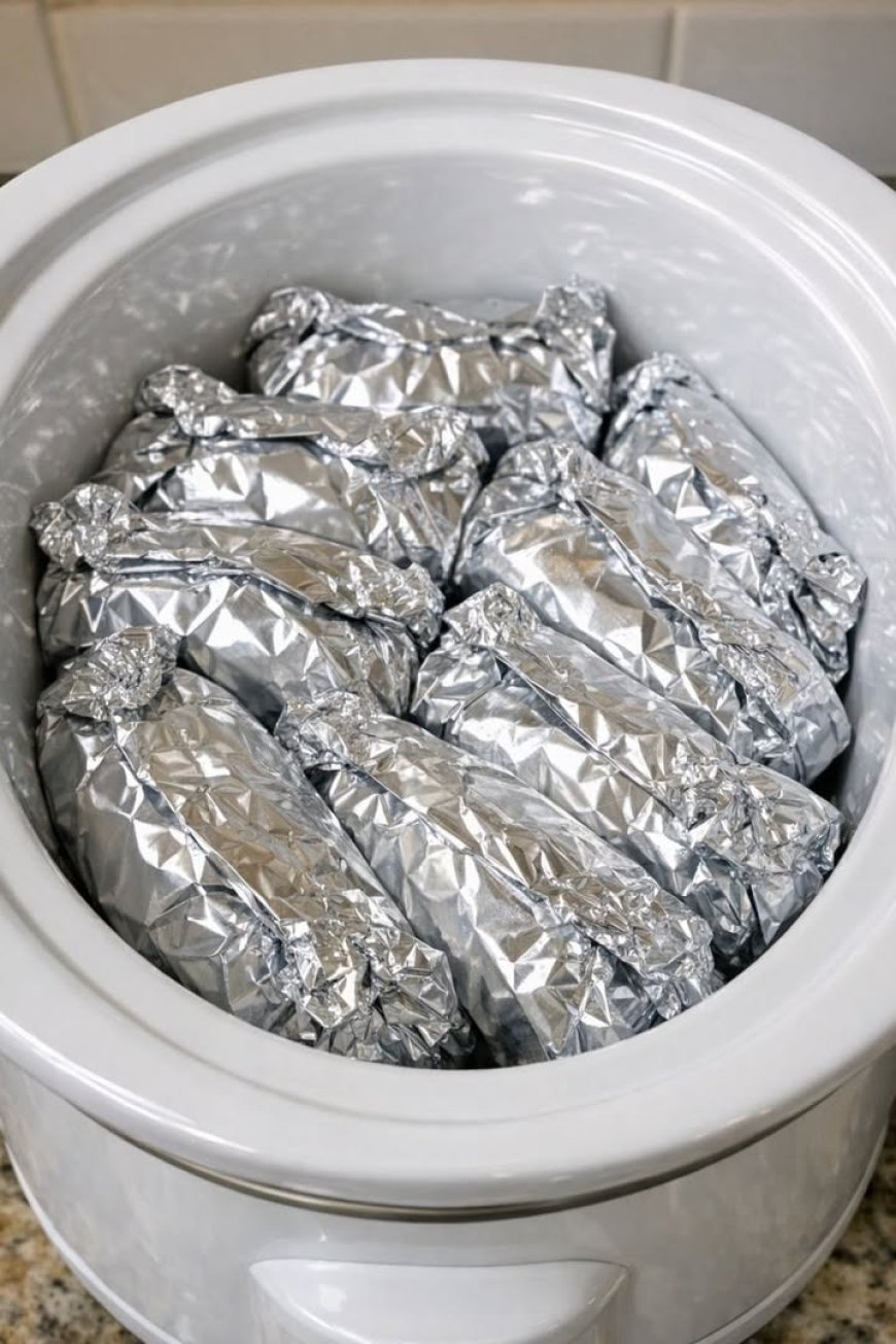 Lege die eingewickelten Äpfel in einen Slow Cooker und lasse sie mehrere Stunden bei niedriger Temperatur garen.