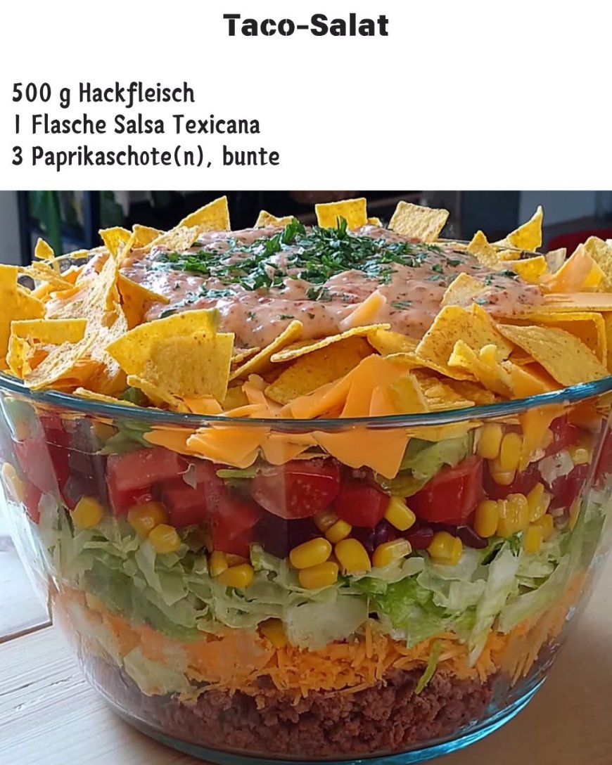 Dieser Taco-Salat ist nicht nur ein optisches Highlight, sondern auch geschmacklich ein absolutes Fest! Mit buntem Gemüse, würzigem Hackfleisch, cremigem Dressing und knusprigen Tortilla-Chips bringt er die Aromen der mexikanischen Küche direkt auf den Tisch. Er eignet sich perfekt für Partys, Familienfeiern oder als außergewöhnliches Hauptgericht im Alltag.