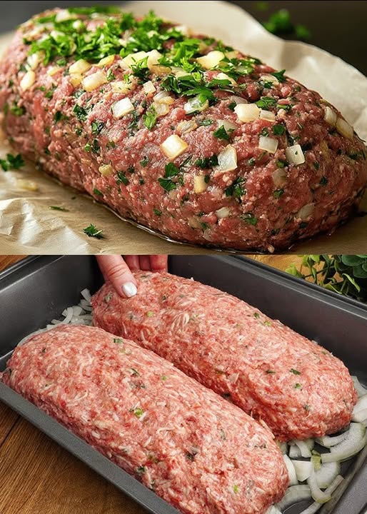 Danach die Hackbratenmischung in eine geölte Kastenform gebe. Die Rinderbrühe über den Hackbraten gießen und die abgekühlte Zwiebelmischung darauf verteilen.
